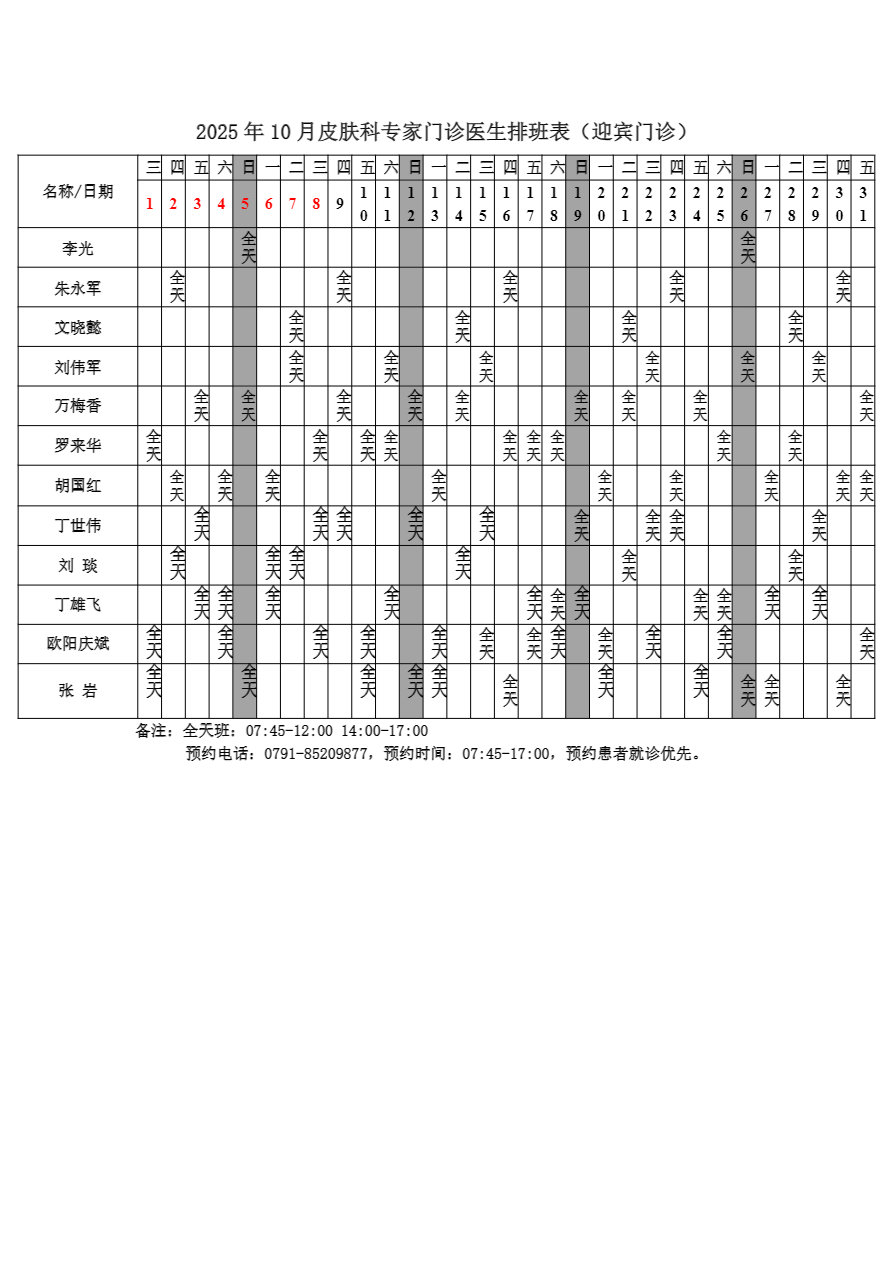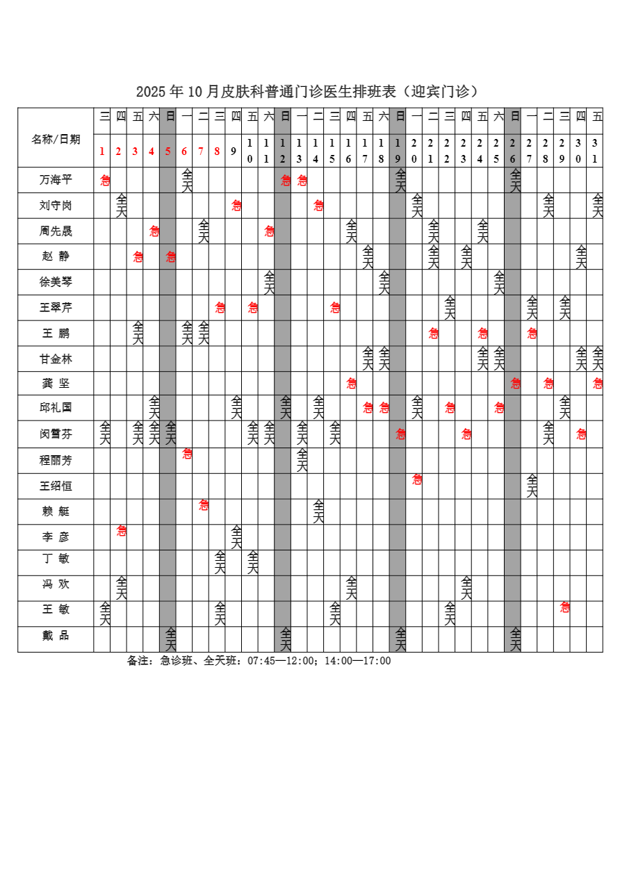 2025年10月份总院门诊医生排班表(迎宾门诊)