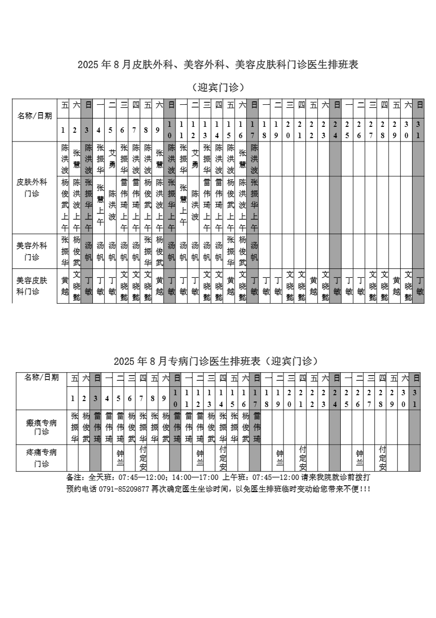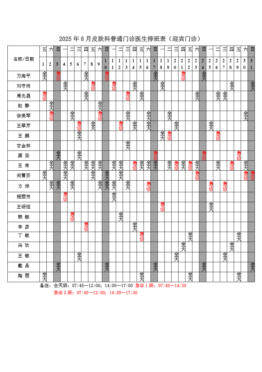2025年7月份总院门诊医生排班表
