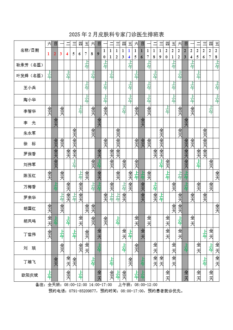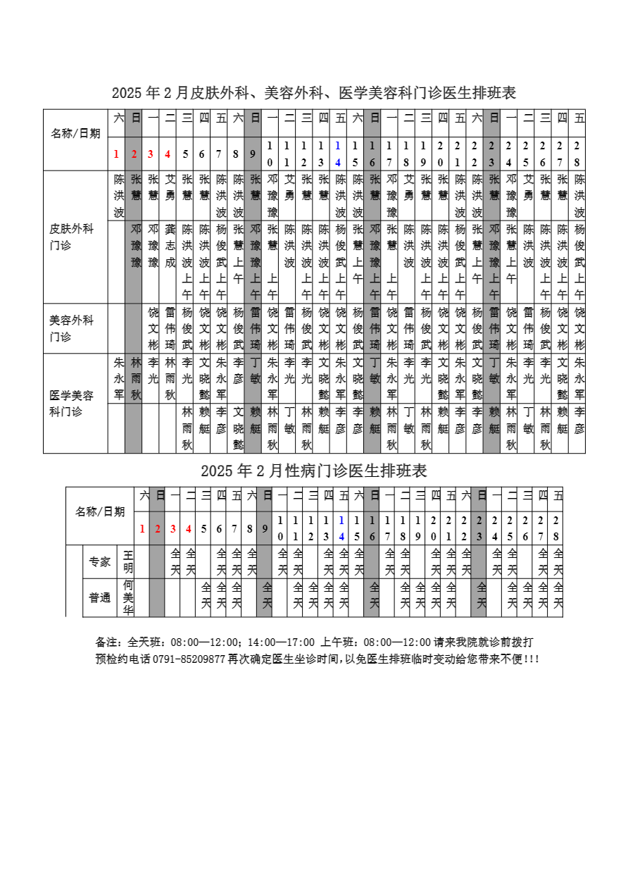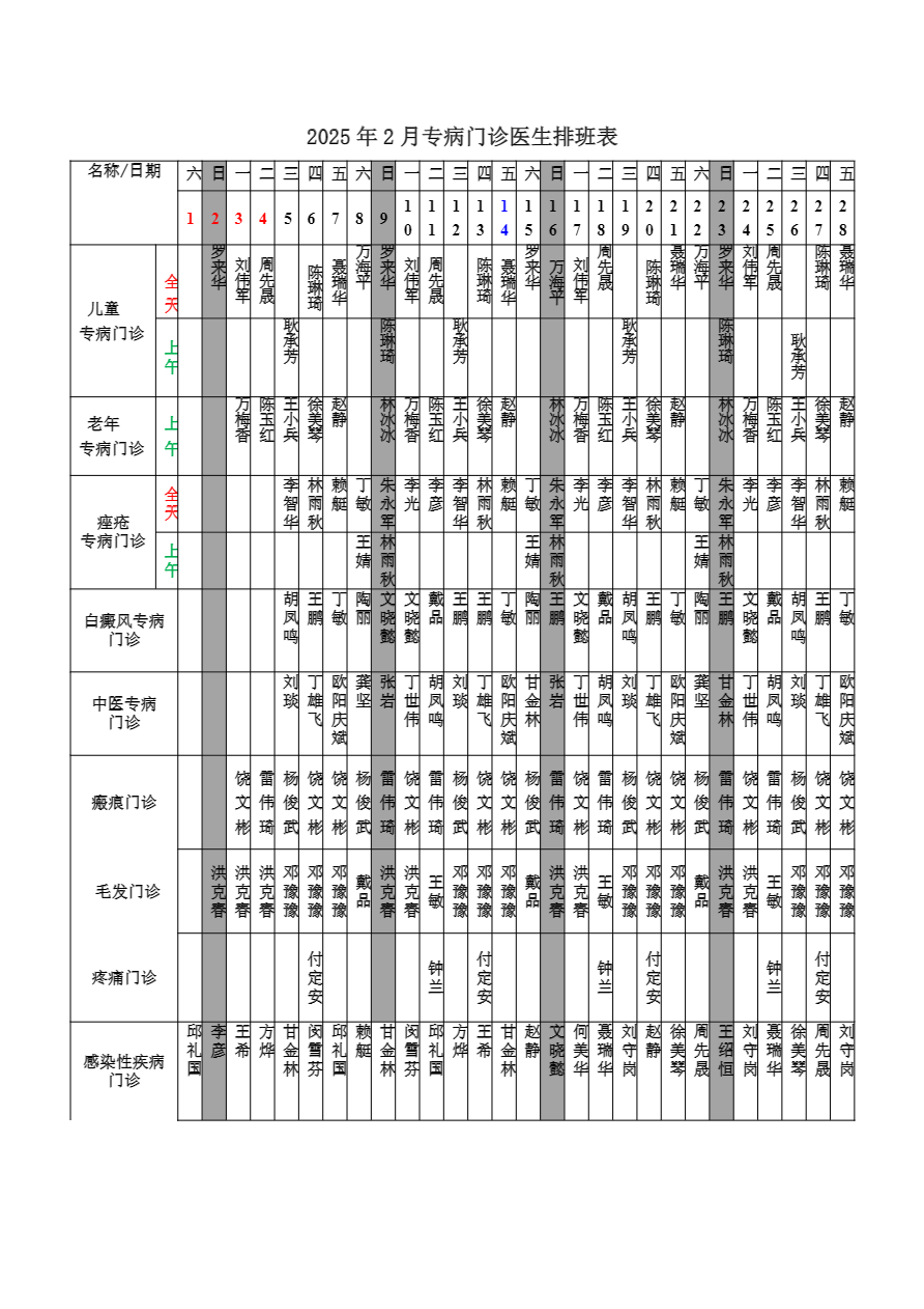 2025年2月份总院门诊医生排班表