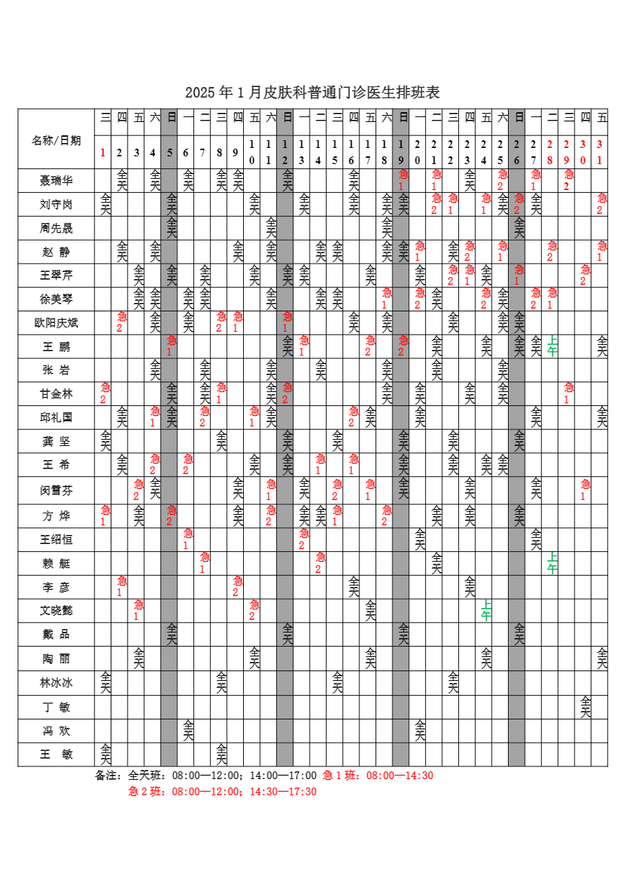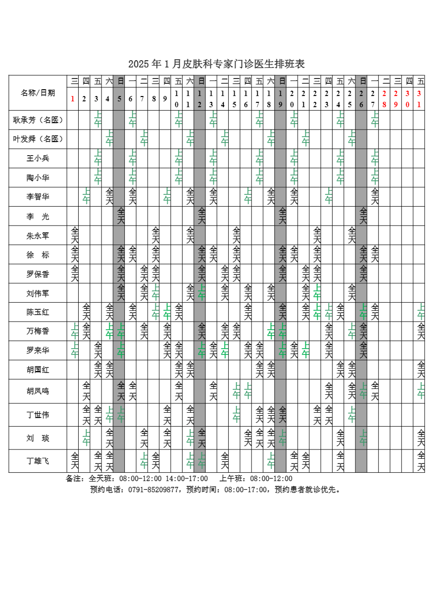 2025年1月份总院门诊医生排班表