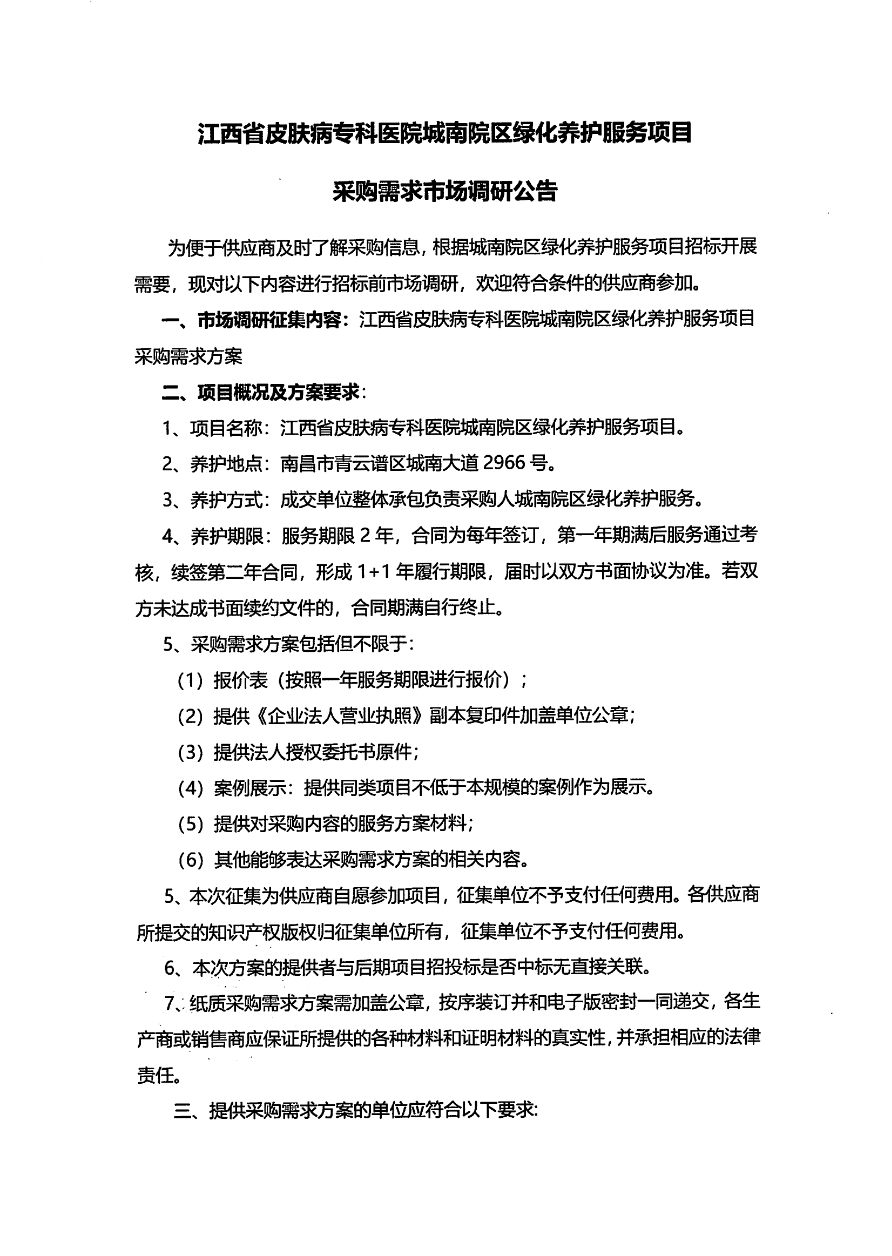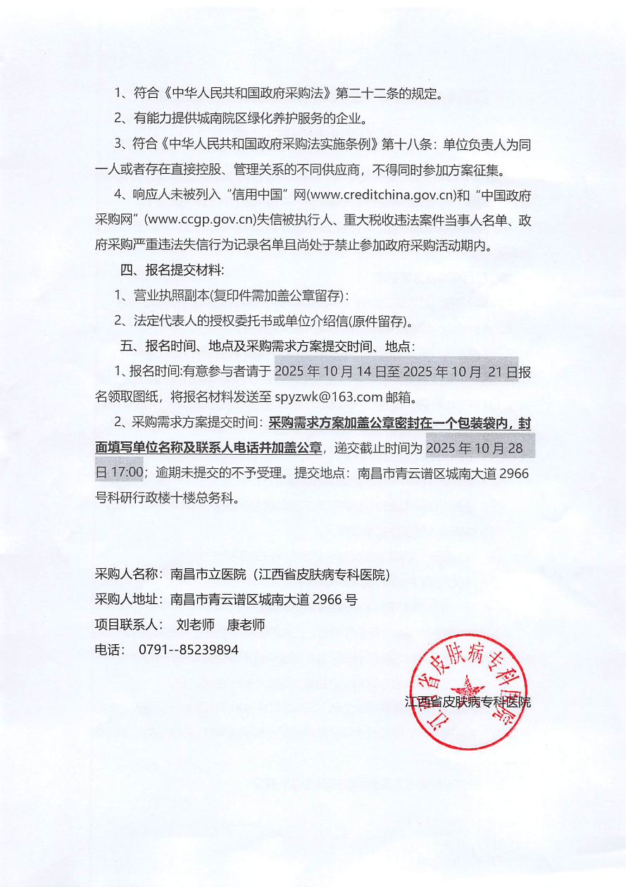 江西省皮肤病专科医院城南院区绿化养护服务项目采购需求市场调研公告