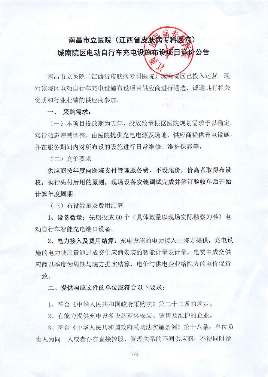 南昌市立医院(江西省皮肤病专科医院)城南院区电动自行车充电设施布设项目竞价公告