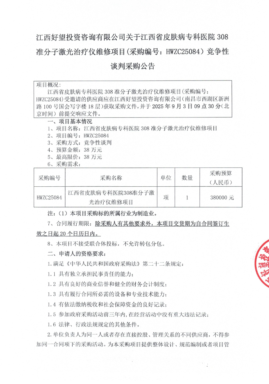 江西省皮肤病专科医院308准分子激光治疗仪维修项目竞争性谈判采购公告