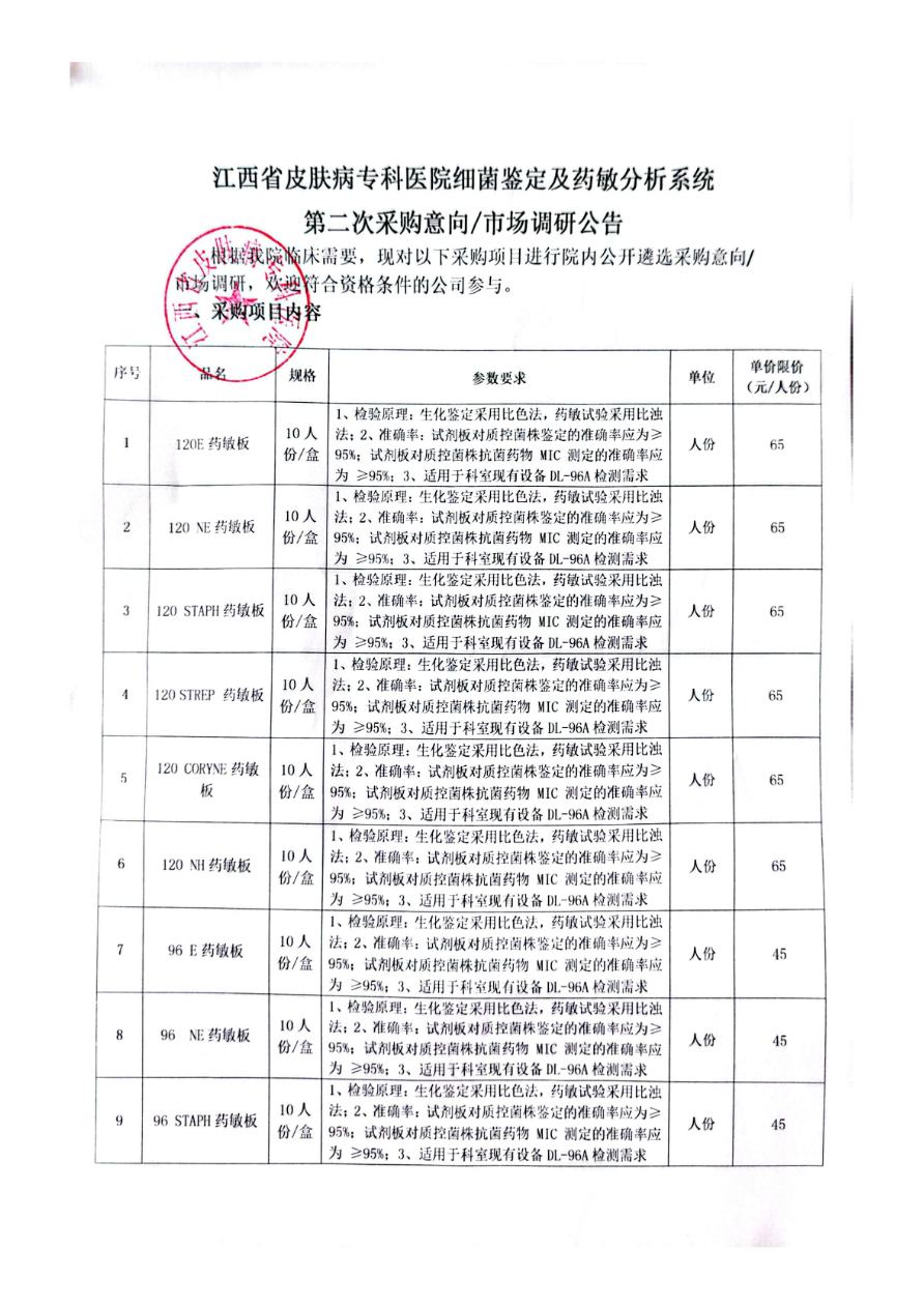 江西省皮肤病专科医院细菌鉴定及药敏分析系统采购系统第二次挂网
