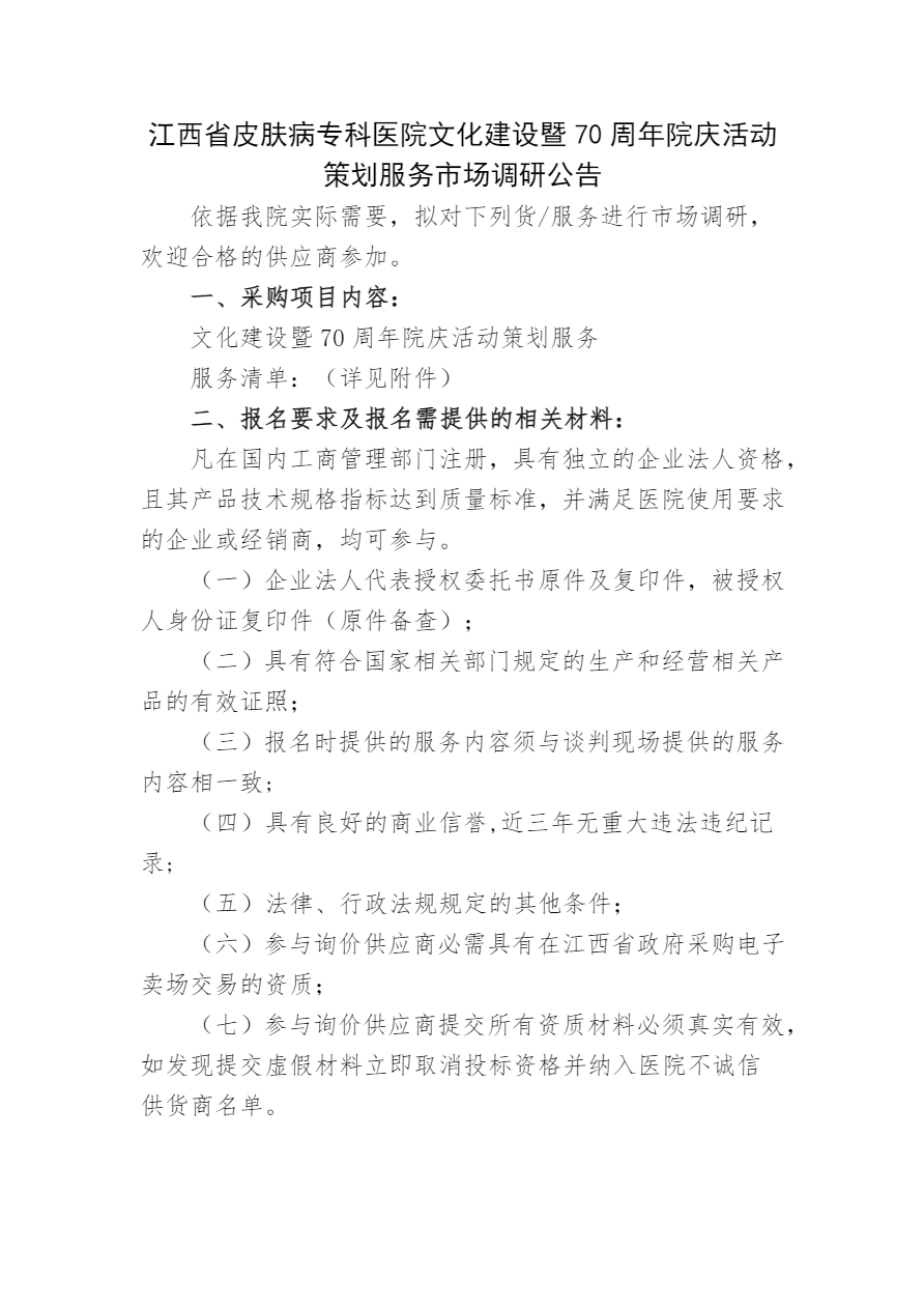 江西省皮肤病专科医院文化建设暨70周年院庆活动策划服务市场调研公告