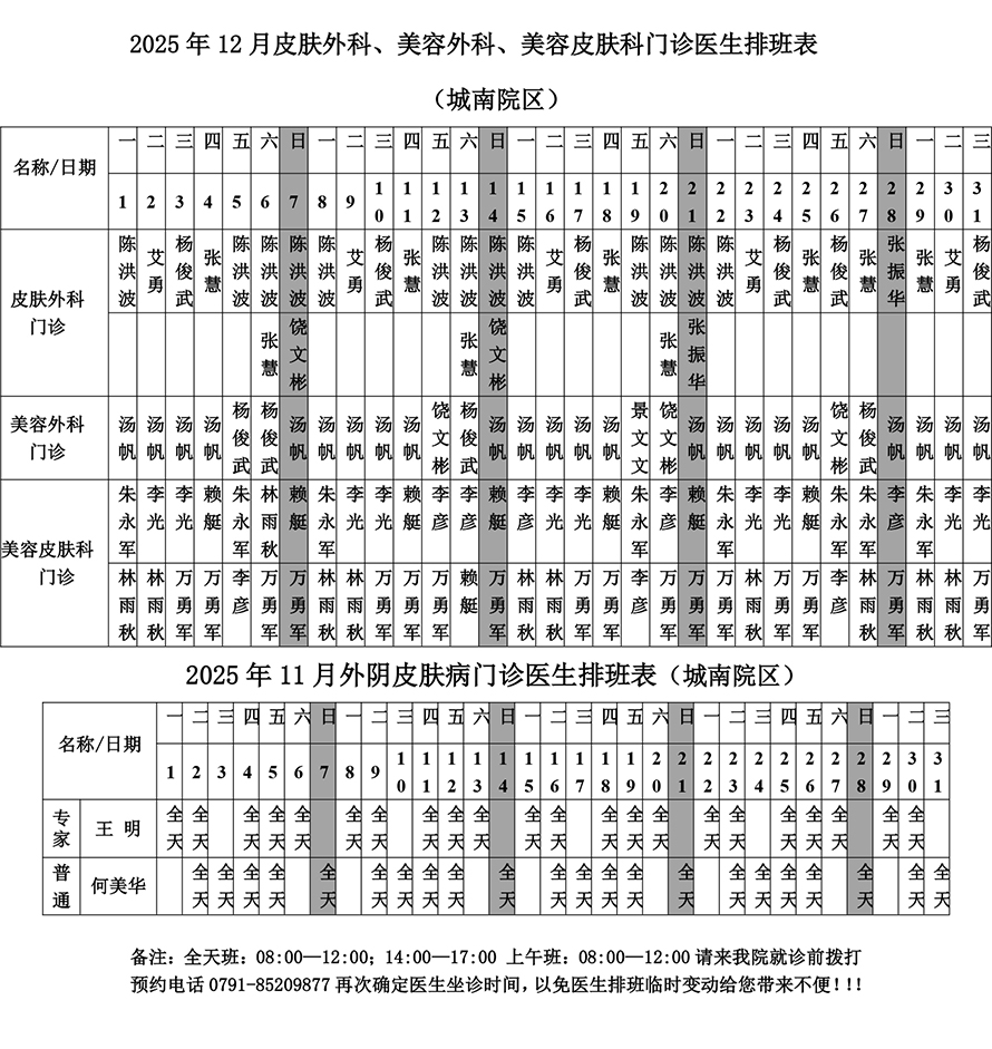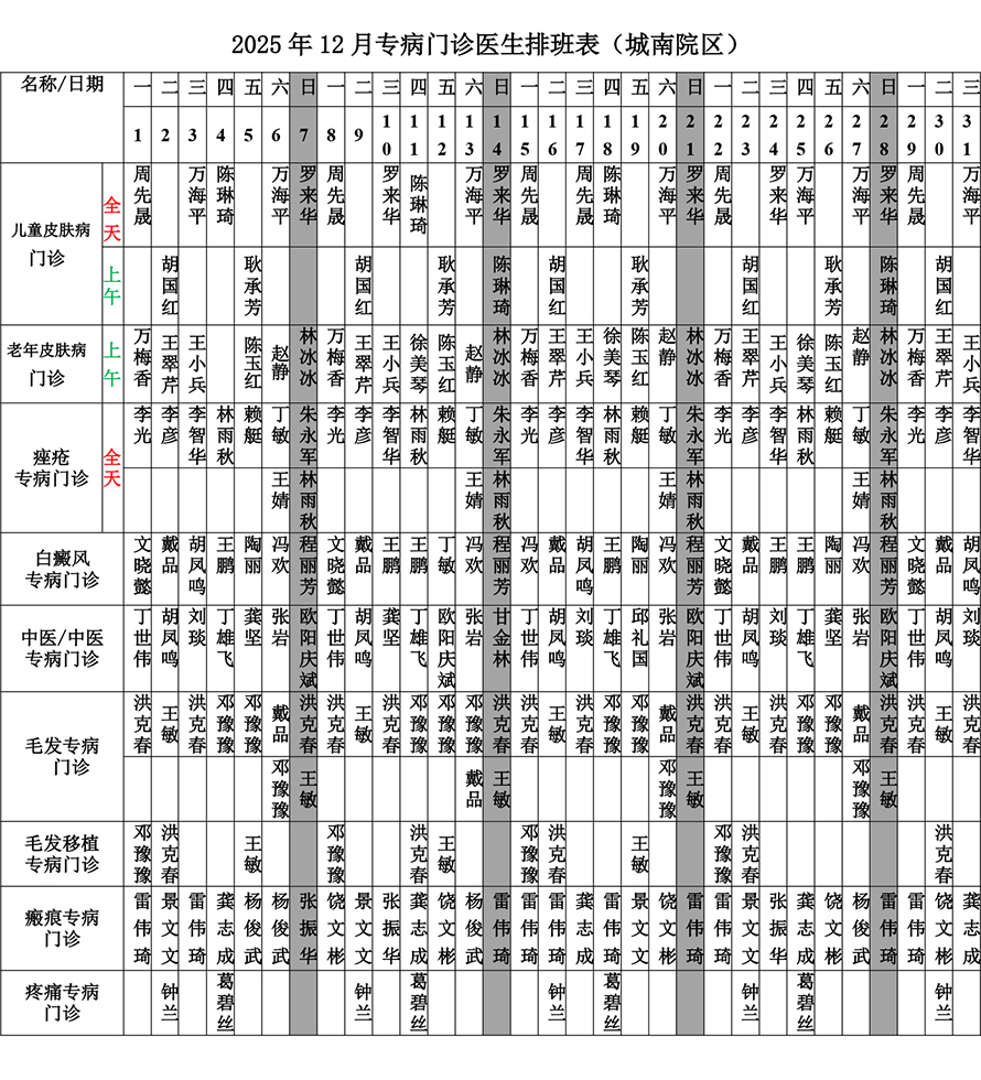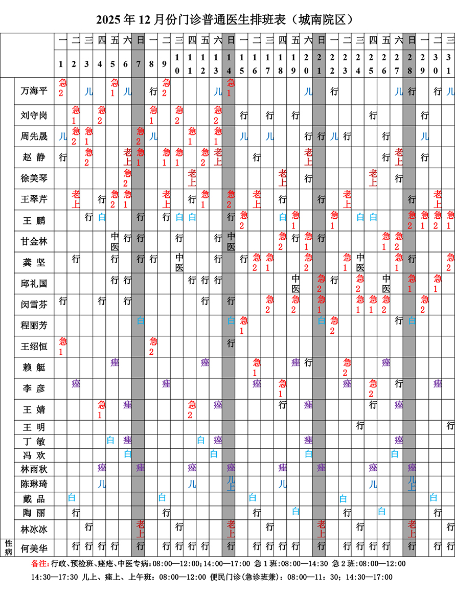 2025年12月份总院门诊医生排班表(城南院区)