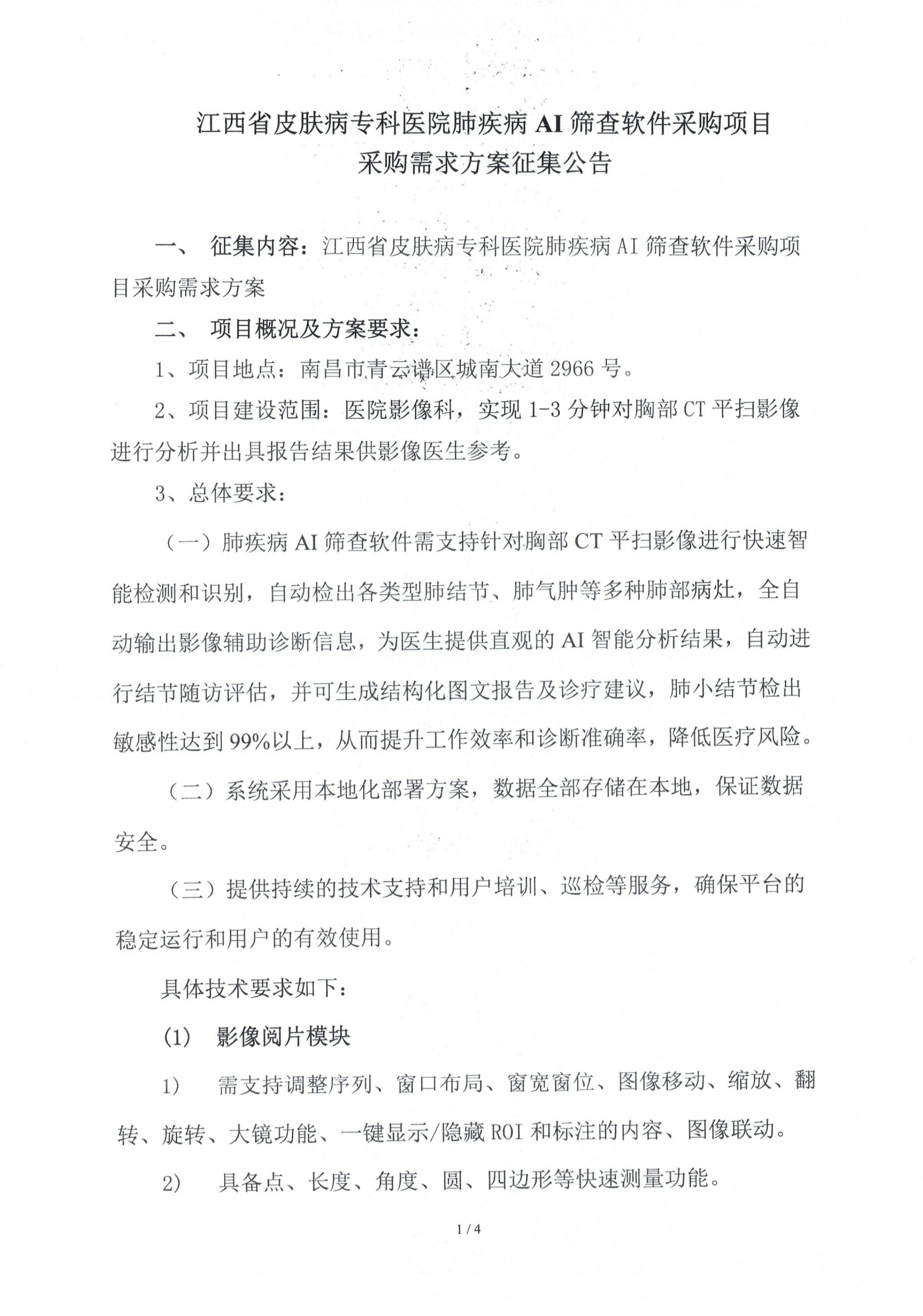 江西省皮肤病专科医院肺疾病AI筛查软件采购项目采购需求方案征集公告