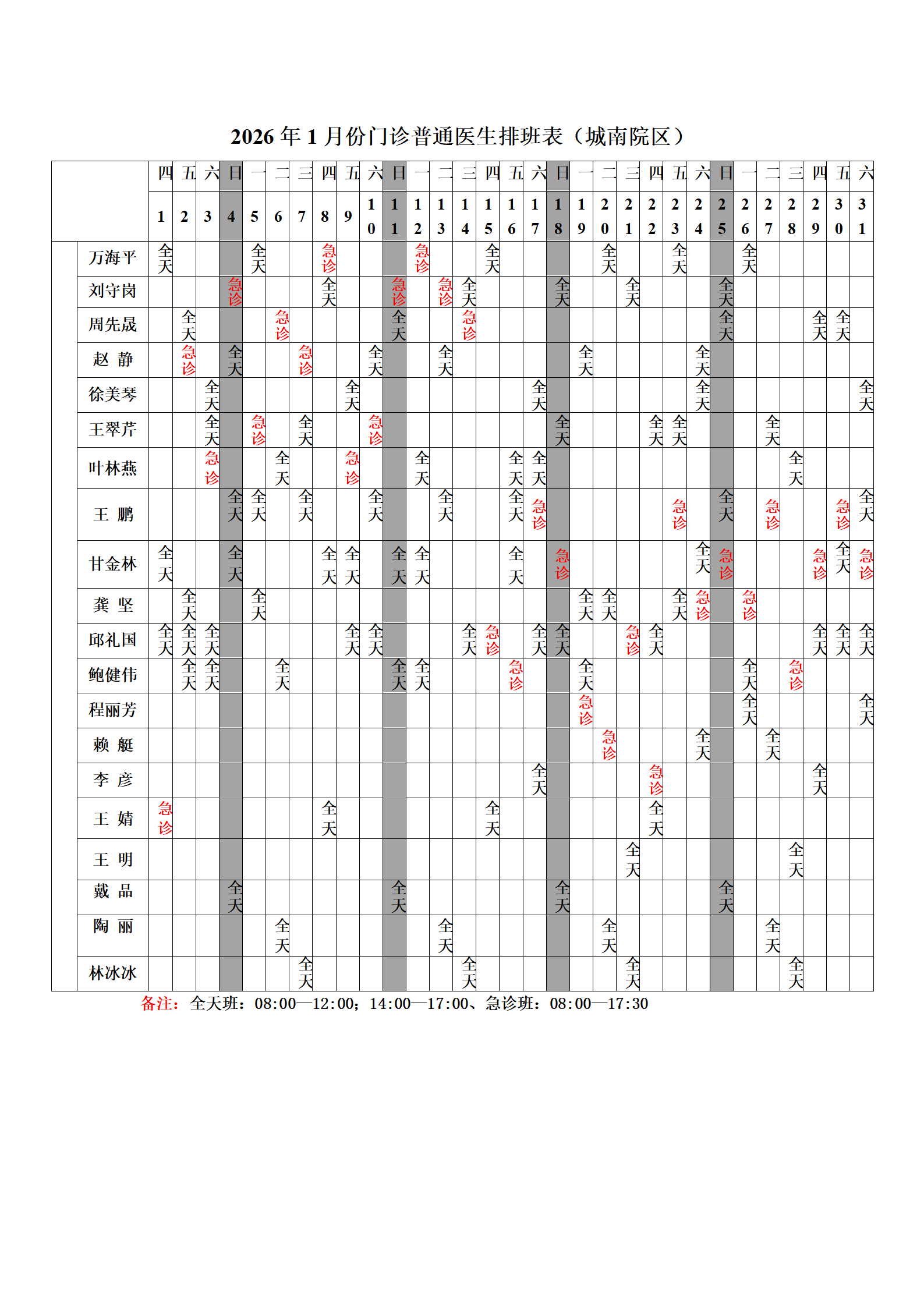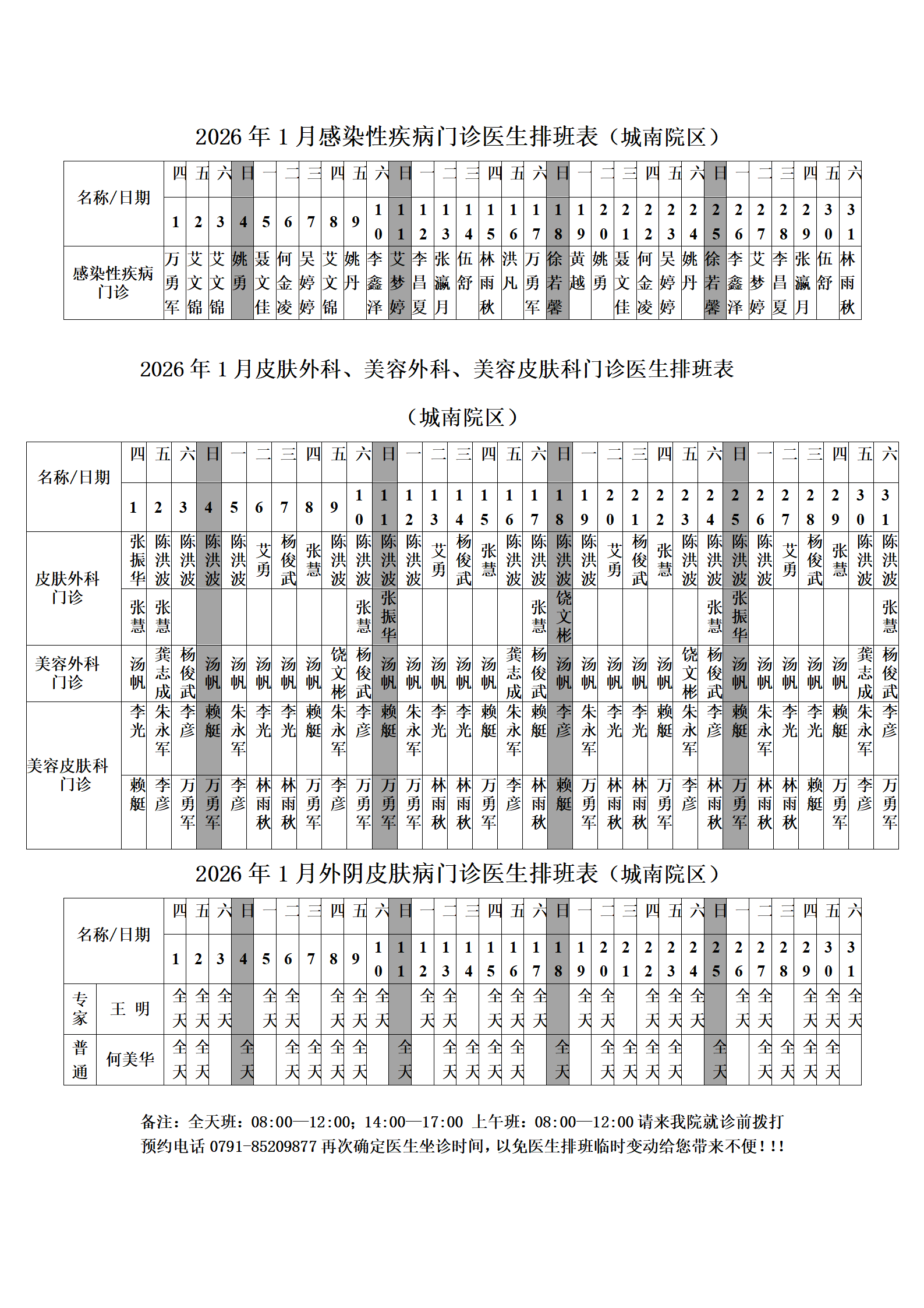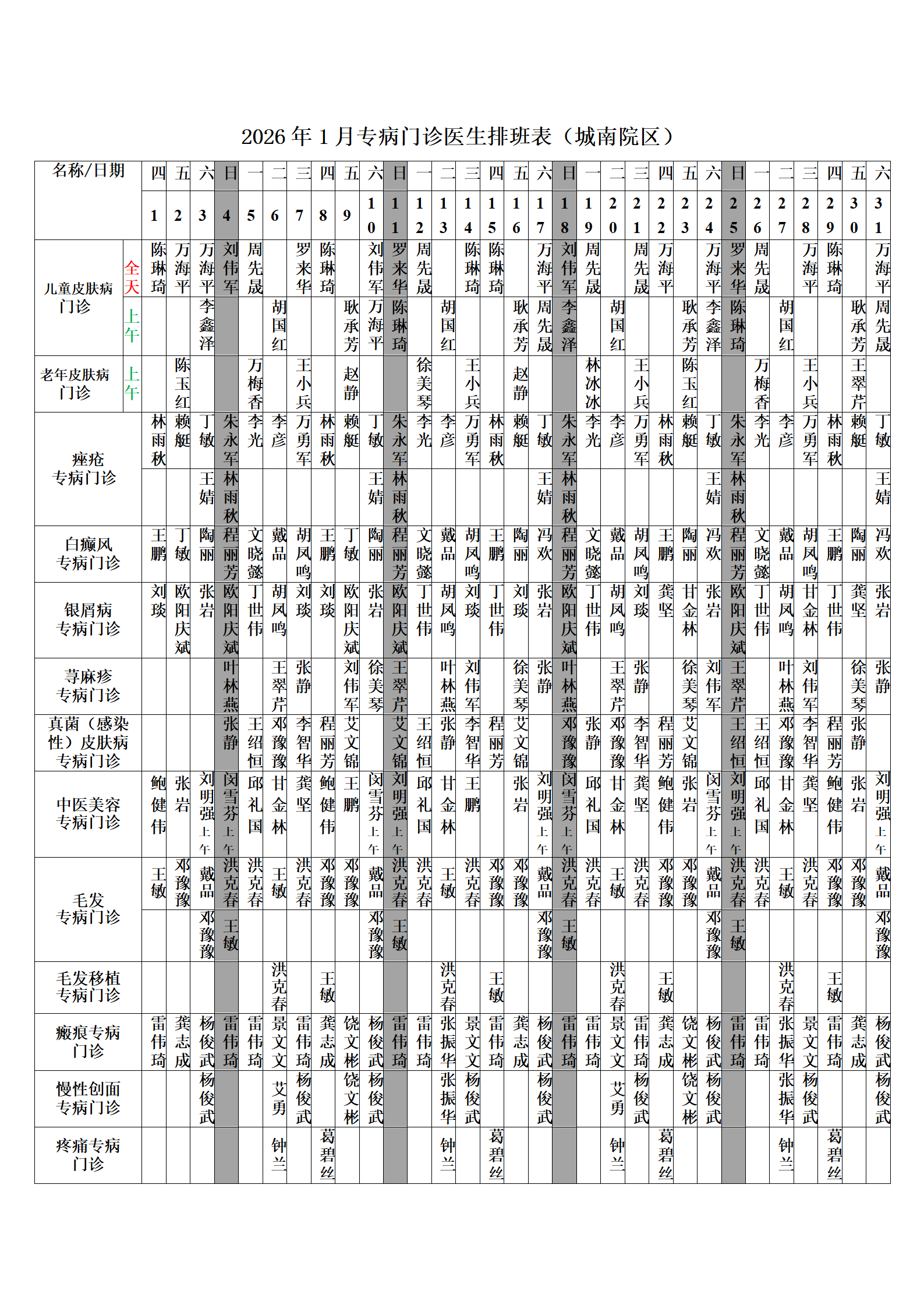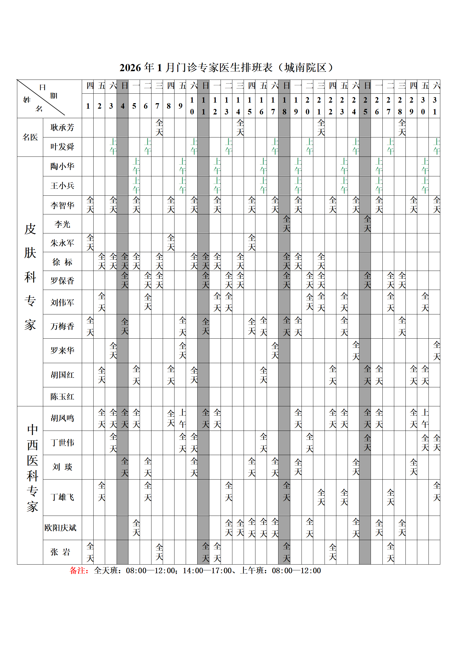 2026年1月份总院门诊医生排班表(城南院区)