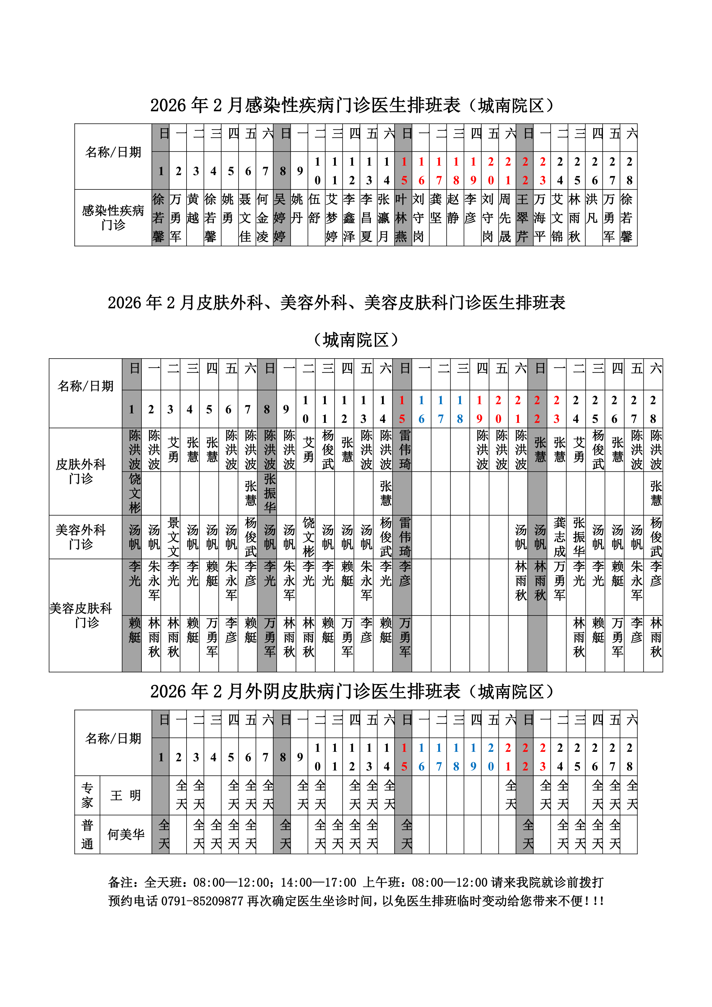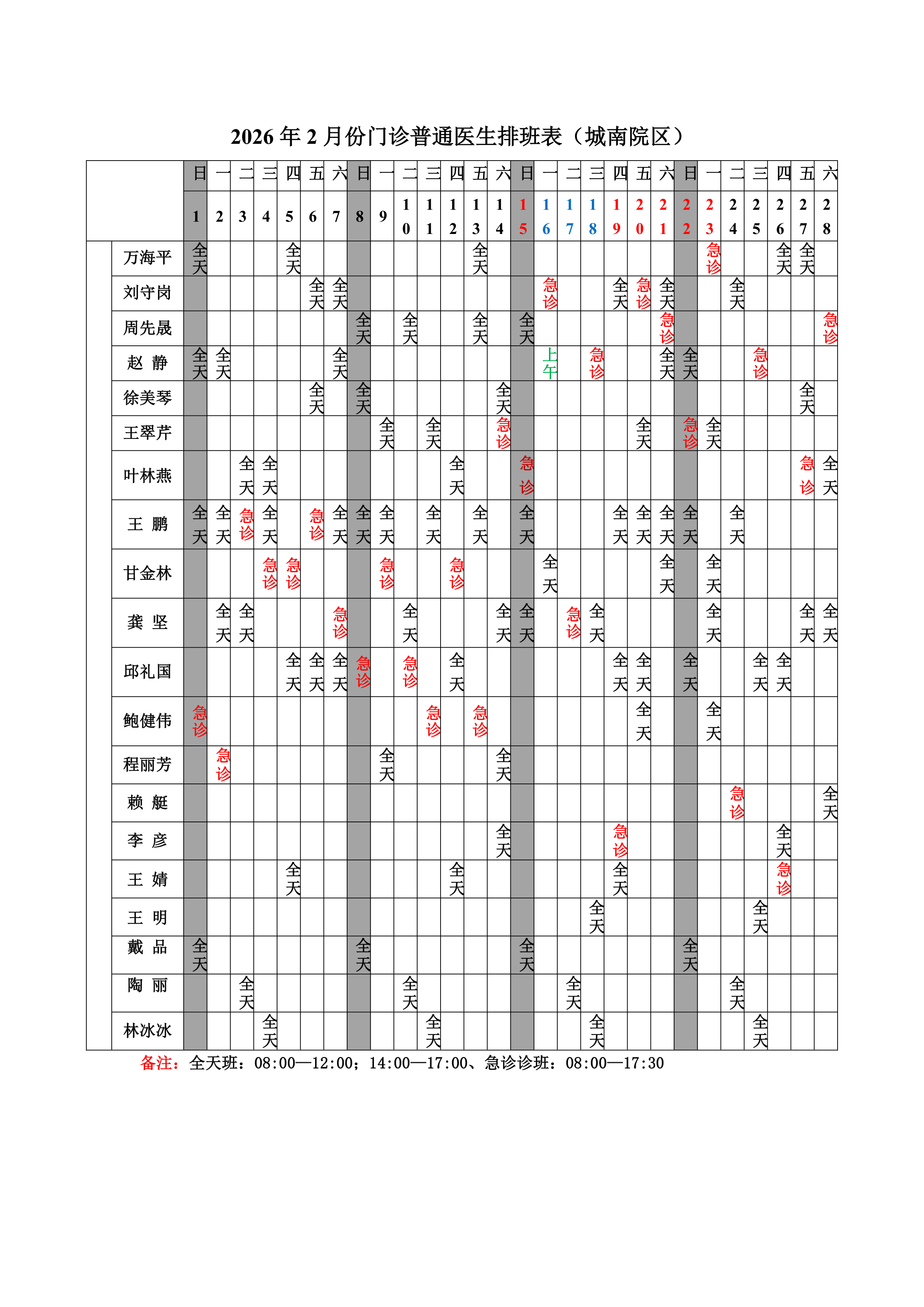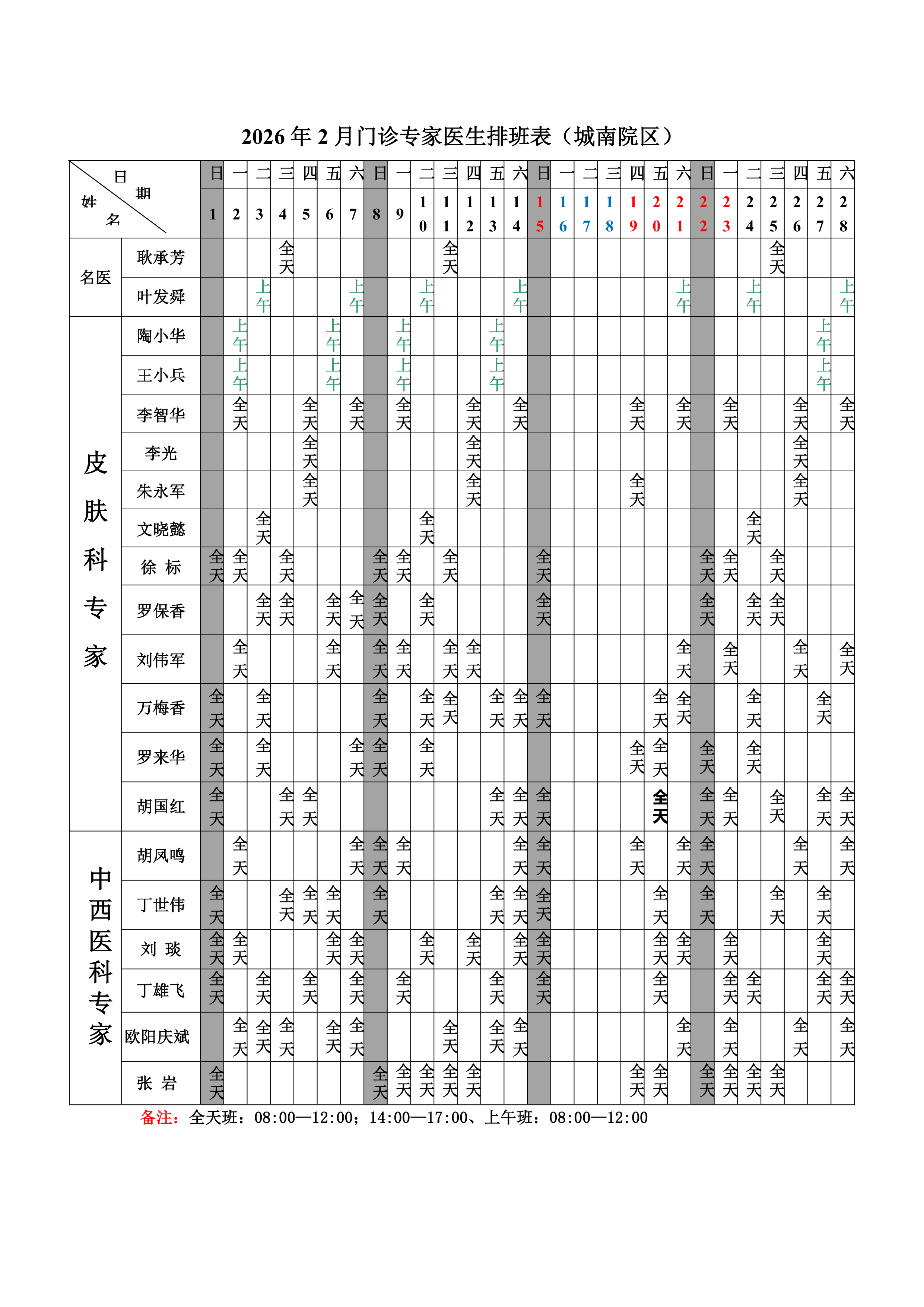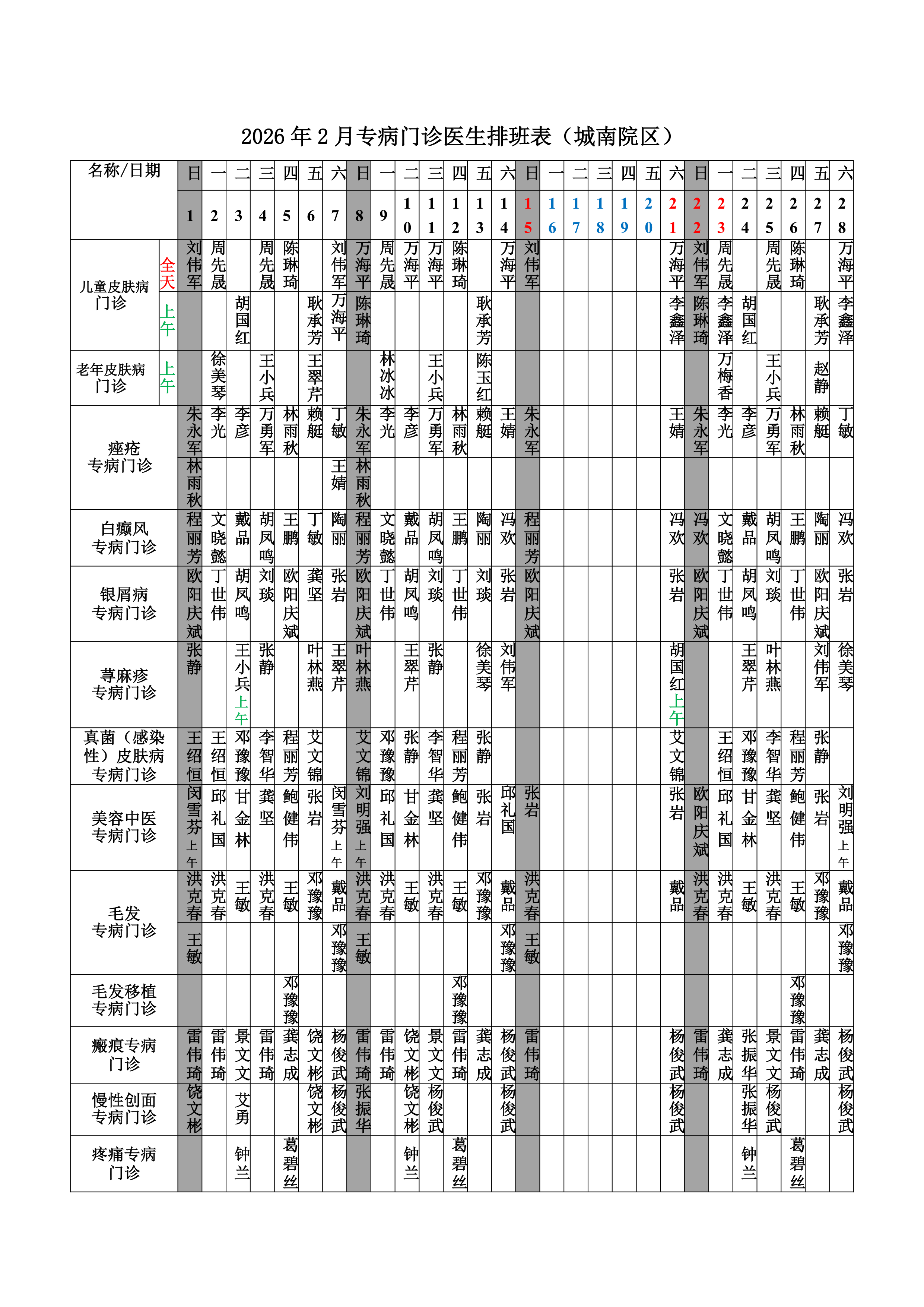 2026年2月份总院门诊医生排班表(城南院区)