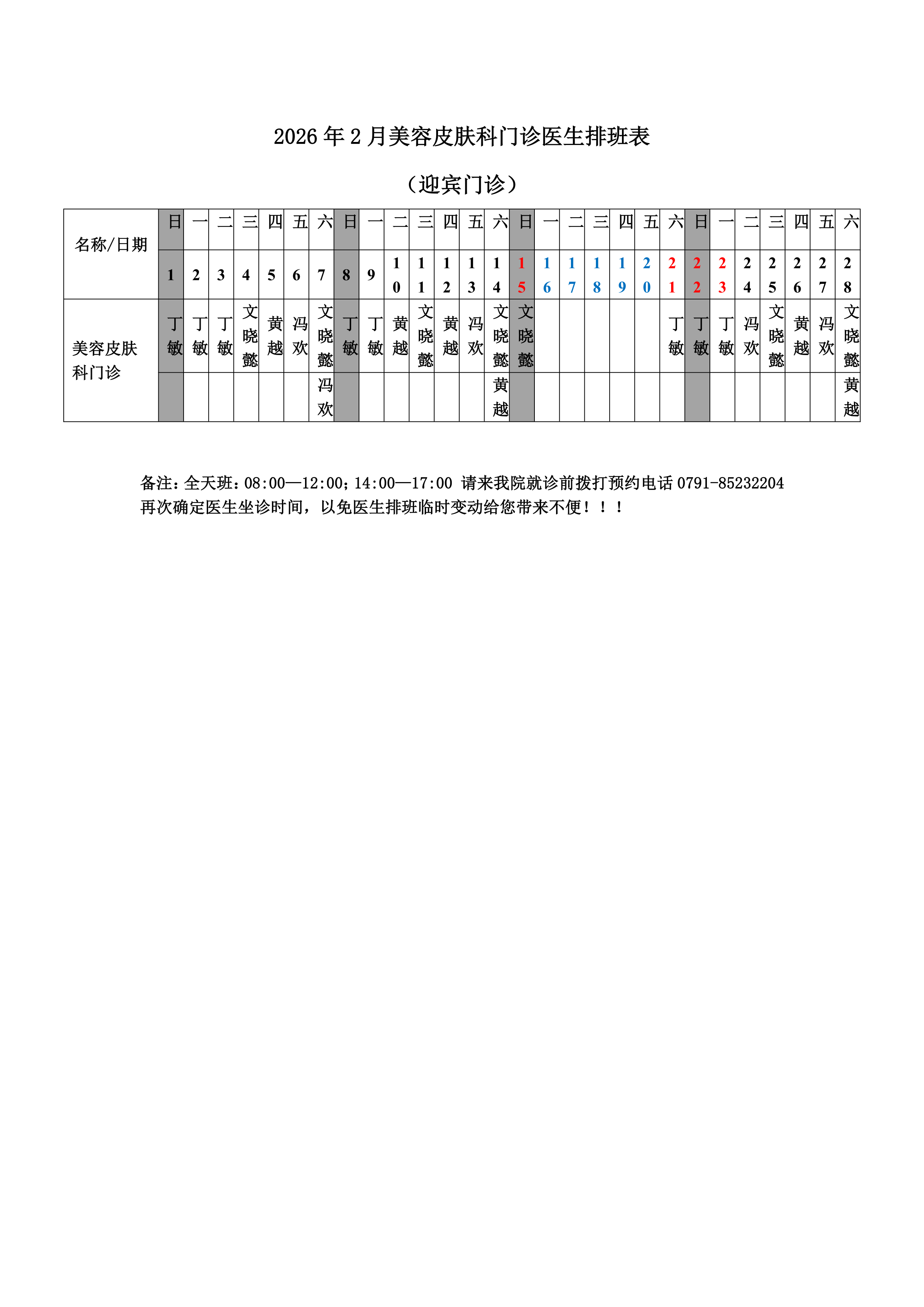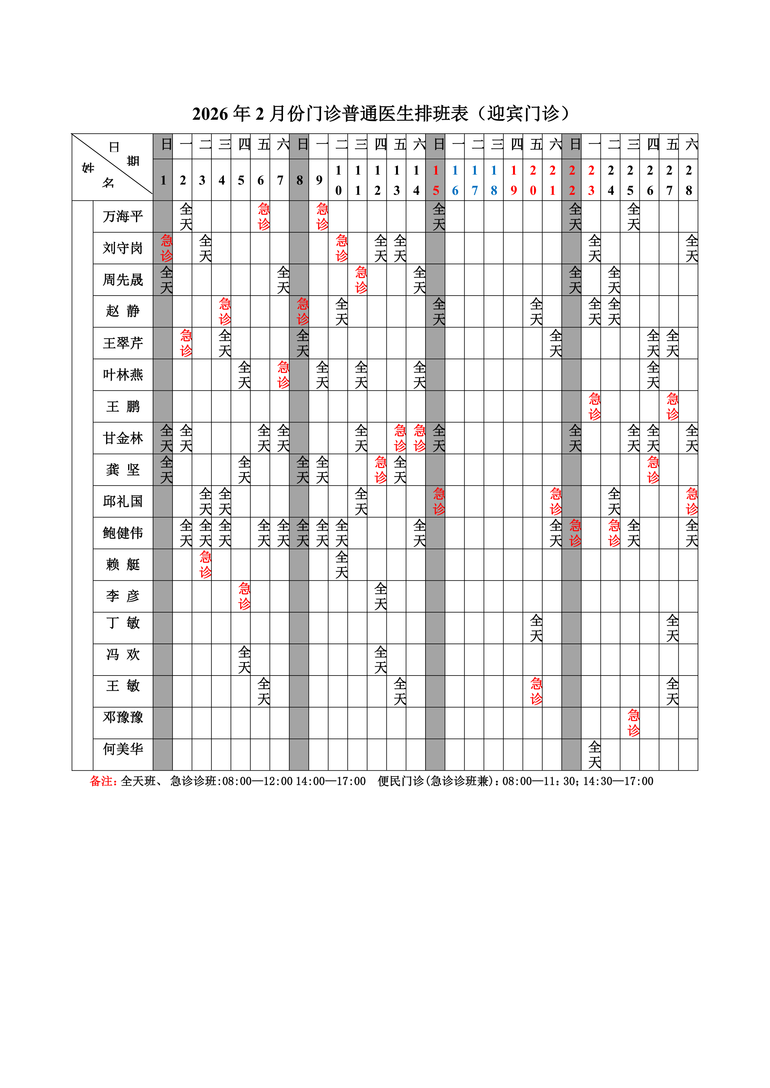 2026年2月份总院门诊医生排班表(迎宾门诊)