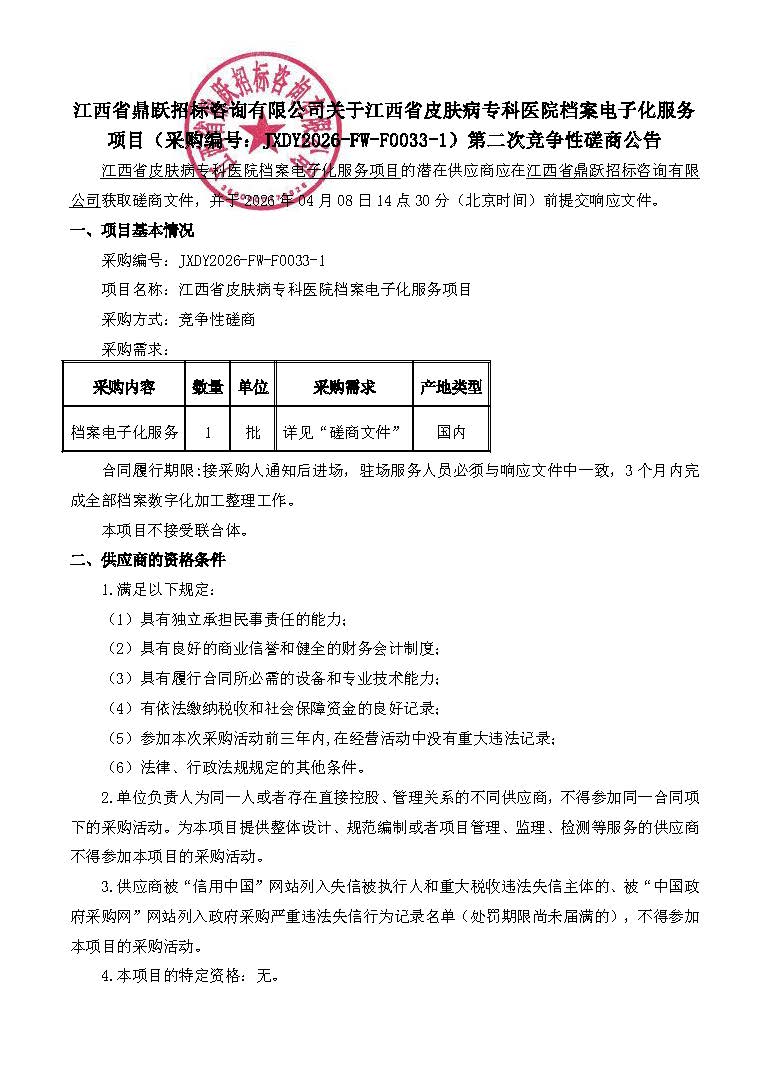 江西省鼎跃招标咨询有限公司关于江西省皮肤病专科医院档案电子化服务项目(采购编号JXDY2026-FW-F0033-1)第二次竞争性磋商公告.pdf