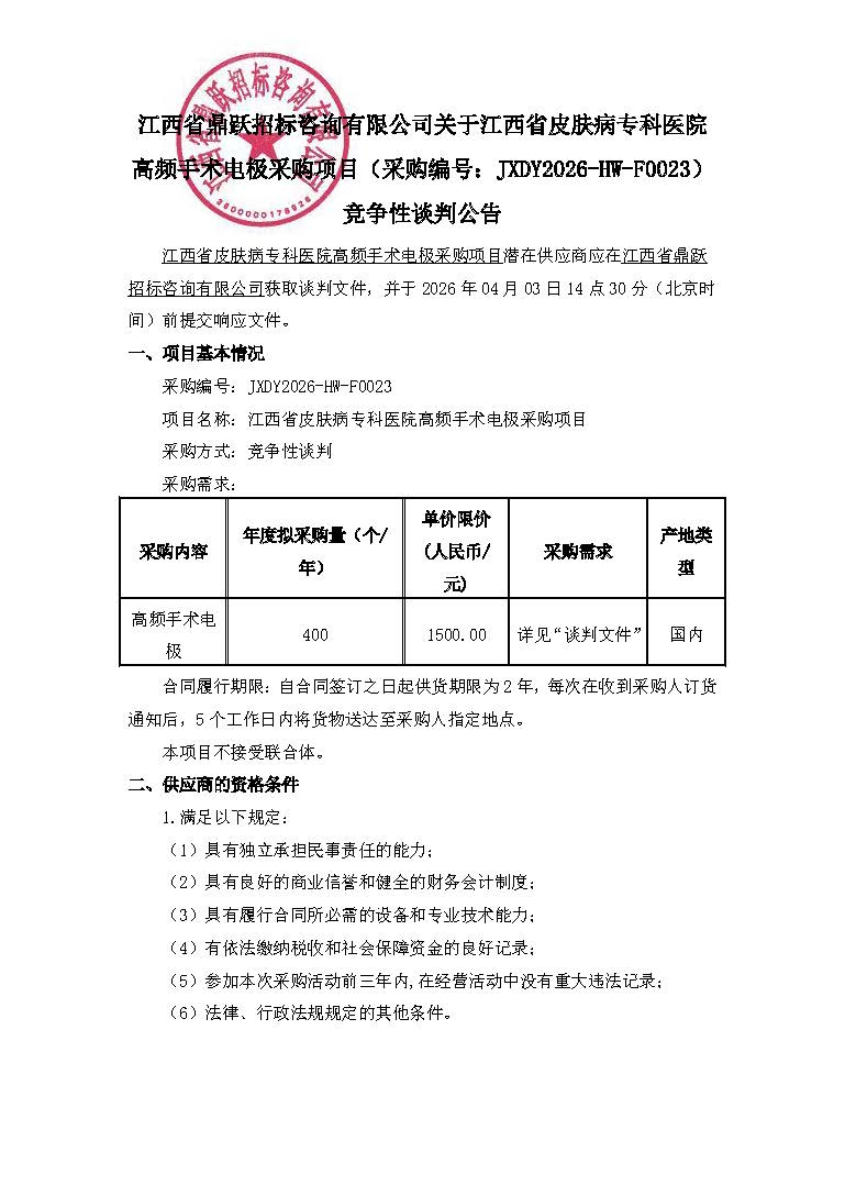 江西省鼎跃招标咨询有限公司关于江西省皮肤病专科医院高频手术电极采购项目(采购编号JXDY2026-HW-F0023)竞争性谈判公告.pdf