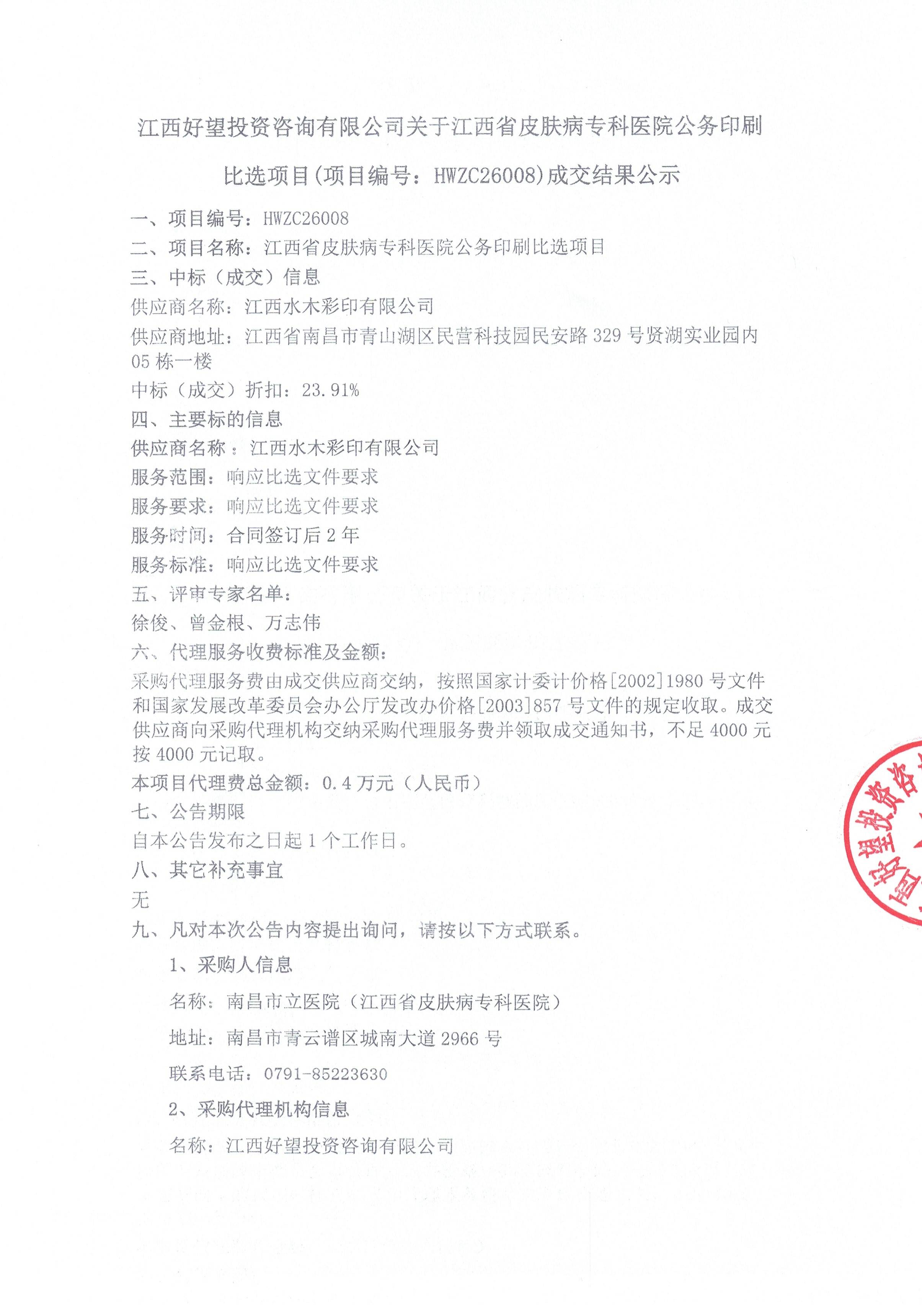 江西好望投资咨询有限公司关于江西省皮肤病专科医院公务印刷比选项目(项目编号HWZC26008)成交结果公示.pdf