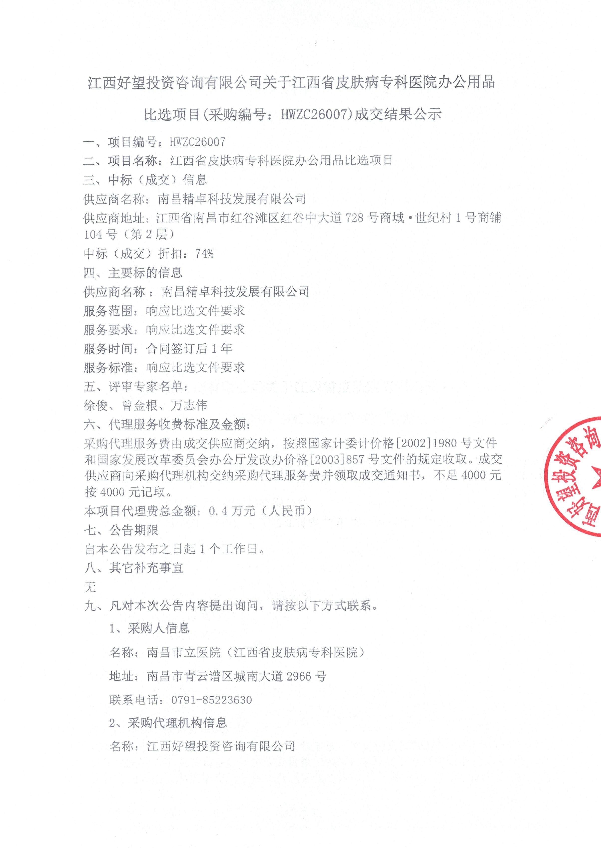 江西好望投资咨询有限公司关于江西省皮肤病专科医院办公用品比选项目(采购编号HWZC26007)成交结果公示.pdf