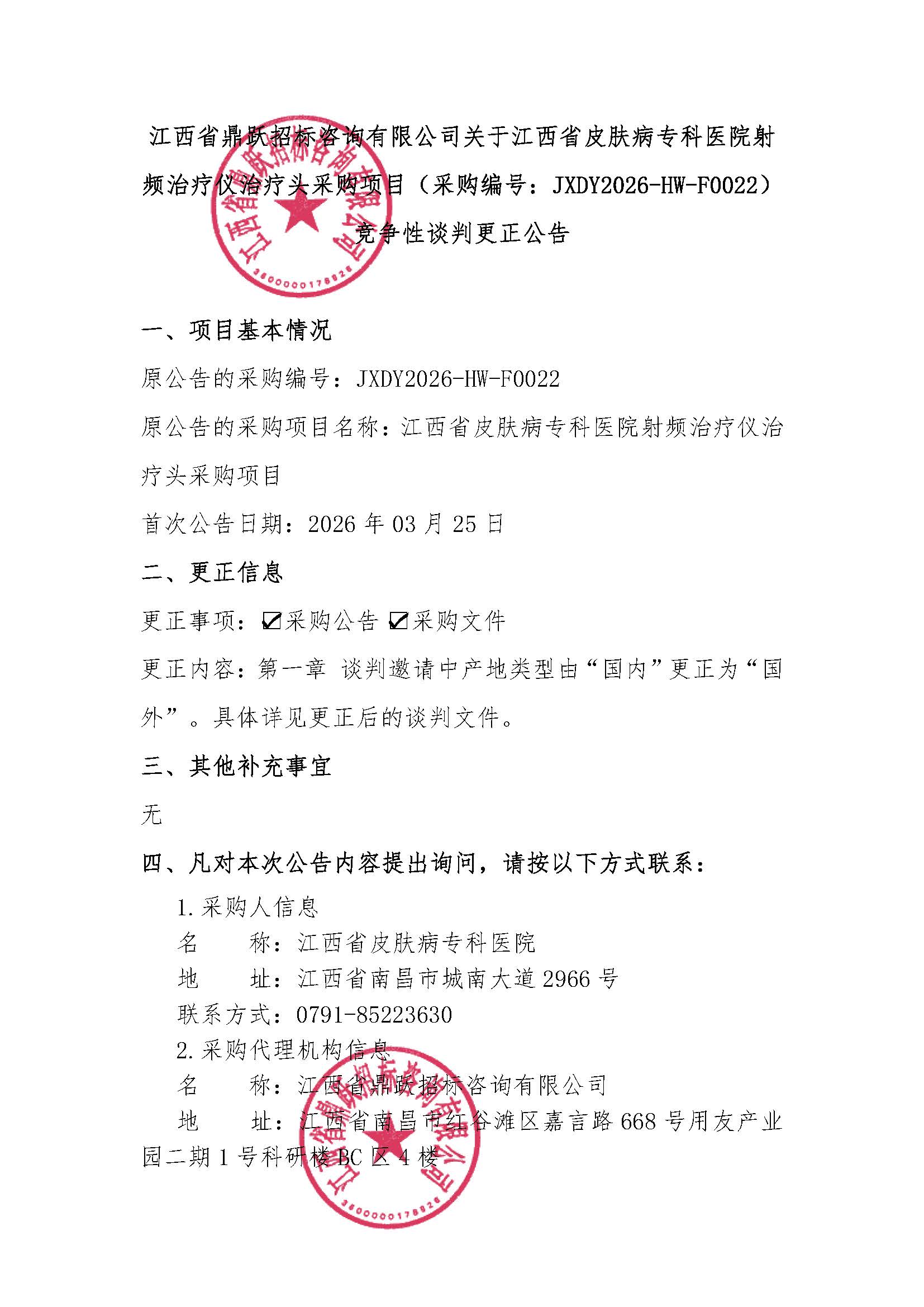 江西省鼎跃招标咨询有限公司关于江西省皮肤病专科医院射频治疗仪治疗头采购项目(采购编号:JXDY2026-HW-F0022)竞争性谈判更正公告.pdf