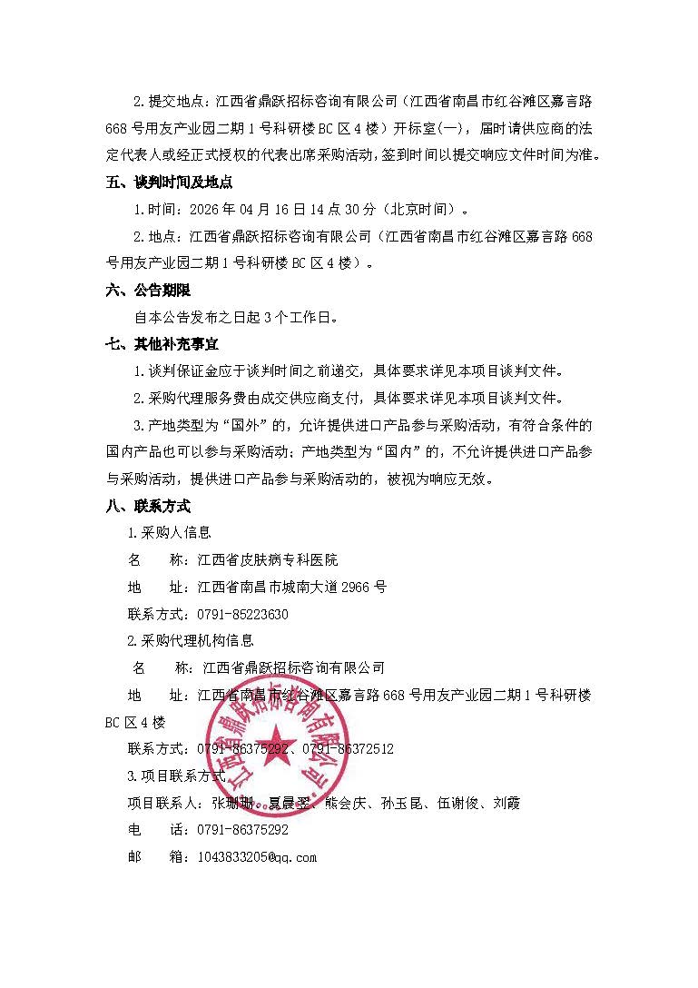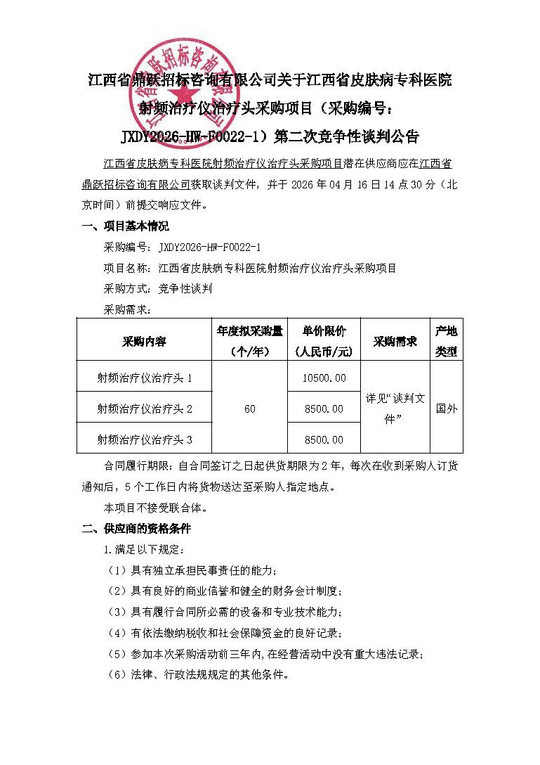 江西省鼎跃招标咨询有限公司关于江西省皮肤病专科医院射频治疗仪治疗头采购项目(采购编号:JXDY2026-HW-F0022-1)第二次竞争性谈判公告.pdf