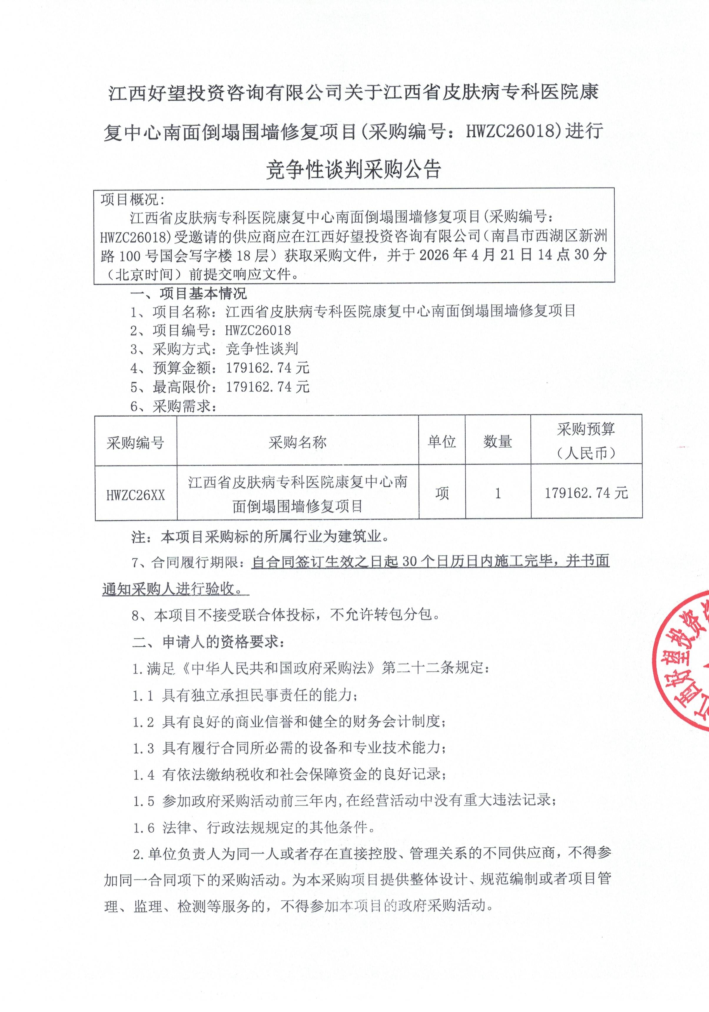 江西好望投资咨询有限公司关于江西省皮肤病专科医院康复中心南面倒塌围墙修复项目(采购编号:HWZC26018)进行竞争性谈判采购公告.pdf
